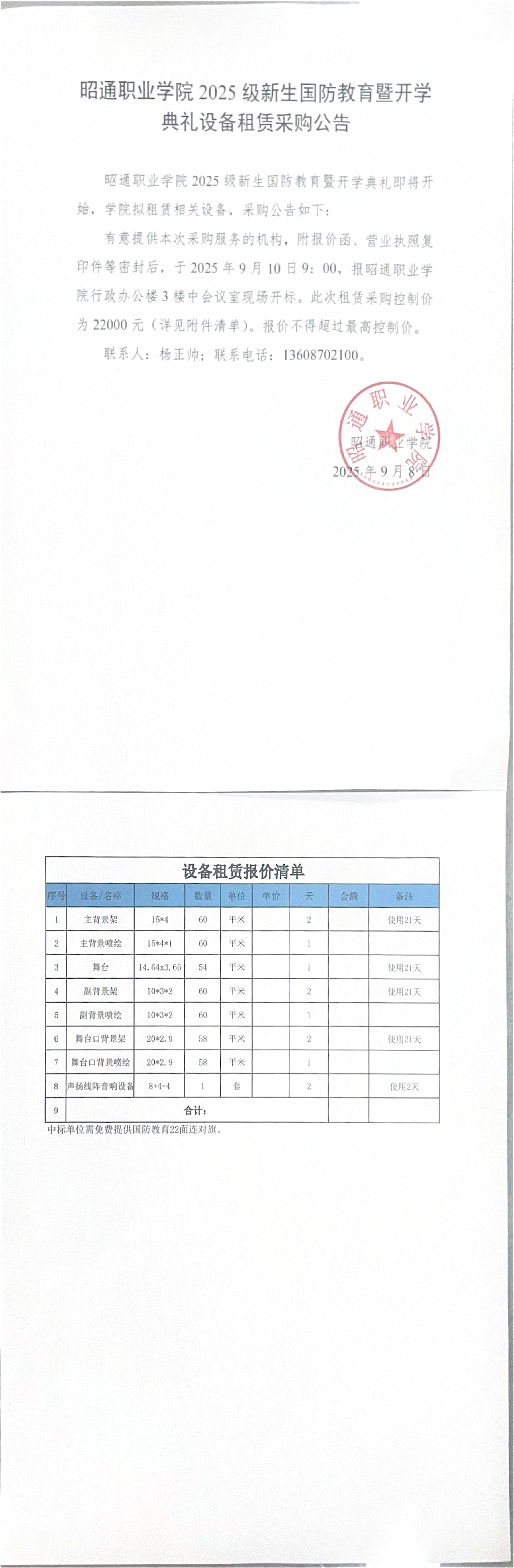 昭通职业学院2025级新生国防教育暨开学典礼设备租赁采购公告