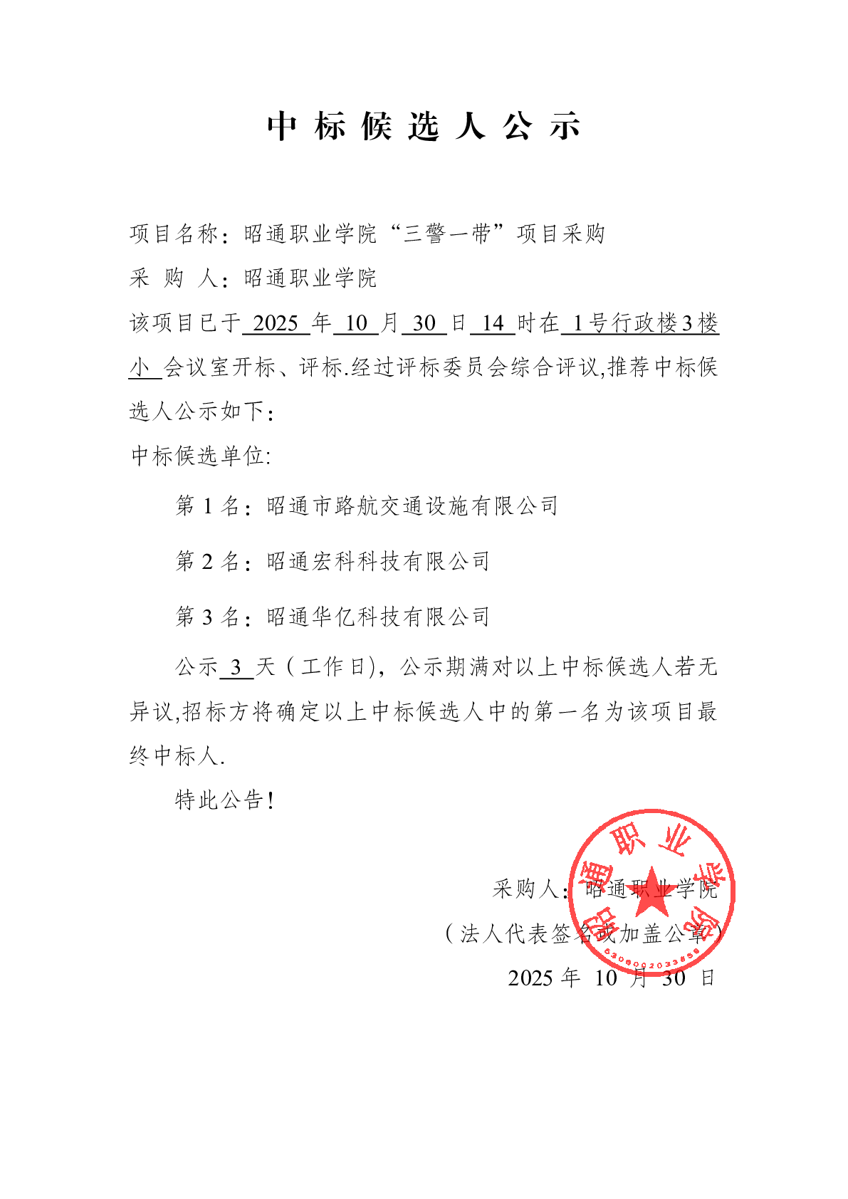昭通职业学院“三警一带”项目采购中标候选人公示
