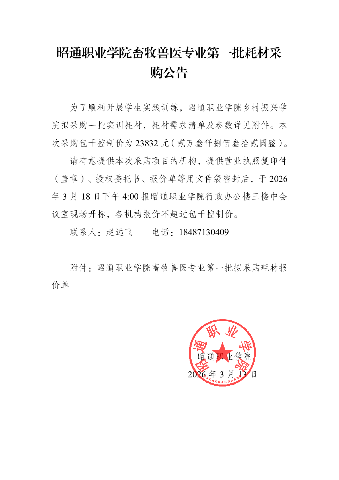 昭通职业学院畜牧兽医专业第一批耗材采购公告