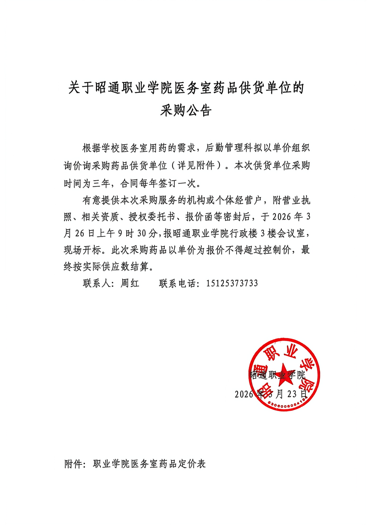 关于昭通职业学院医务室药品供货单位的采购公告